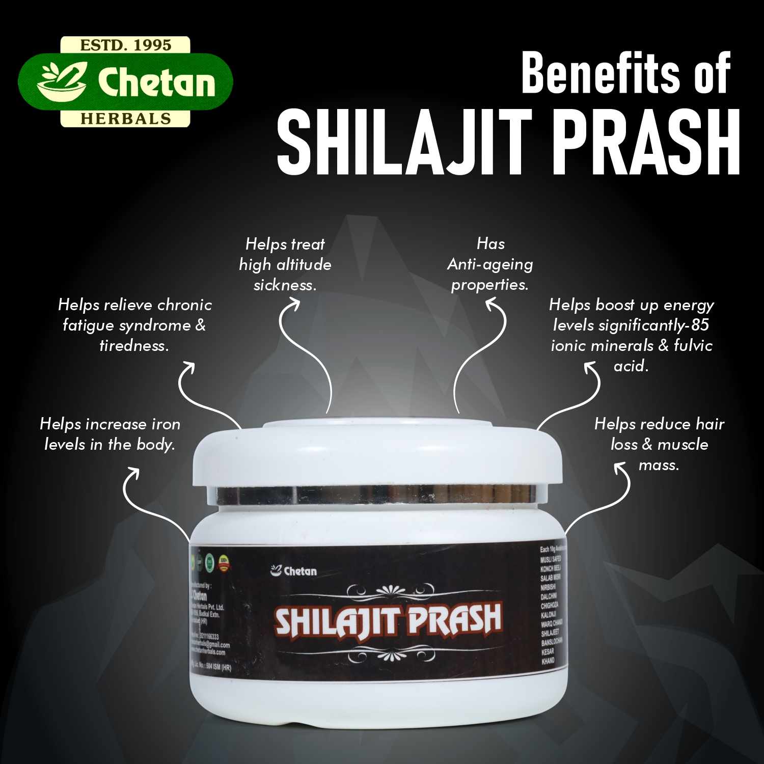 हमारी संस्था चेतन हर्बल्स ने Shilajit Prash कैप्सूल का निर्माण किया है, जो आपके शरीर को अंदर से मजबूत बनाने में मदद करता है। यह थकान और कमजोरी को कम करता है, आपकी ऊर्जा बढ़ाता है, स्टैमिना सुधारता है और शरीर में नई जान भरता है। यह 100% आयुर्वेदिक है और इसका शरीर पर कोई भी नुकसान, साइड-इफ़ेक्ट या दुष्प्रभाव नहीं होता। लड़के और लड़कियां दोनों इसका सेवन कर सकते हैं। नियमित सेवन करने पर पहले 10 दिनों के भीतर ही आप फर्क महसूस कर सकते हैं। Shilajit Prash शरीर के पाचन, मांसपेशियों और हड्डियों को दुरुस्त रखने में भी सहायक है, जिससे आप स्वस्थ, ऊर्जावान और एक्टिव महसूस करेंगे।